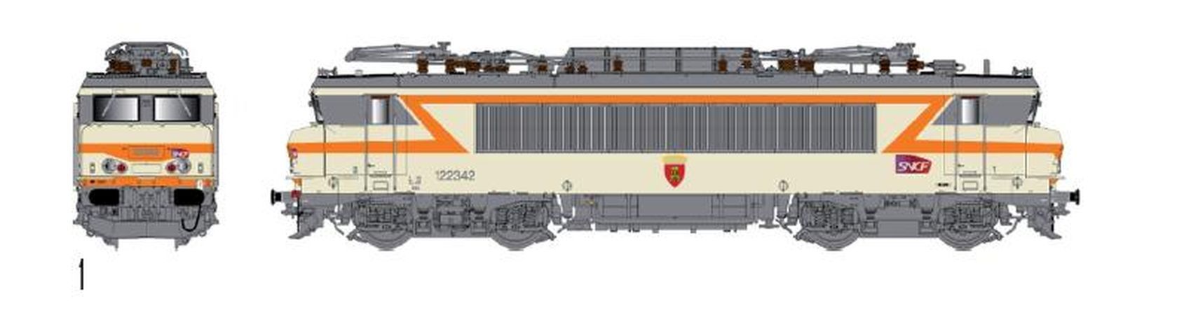 Modèle réduit LS Models représentant une locomotive électrique BB 22342 sonorisée livrée gris/orange, logo carmillon, numéro frontal, grande cabine, blason Carnoules du dépôt de Marseille