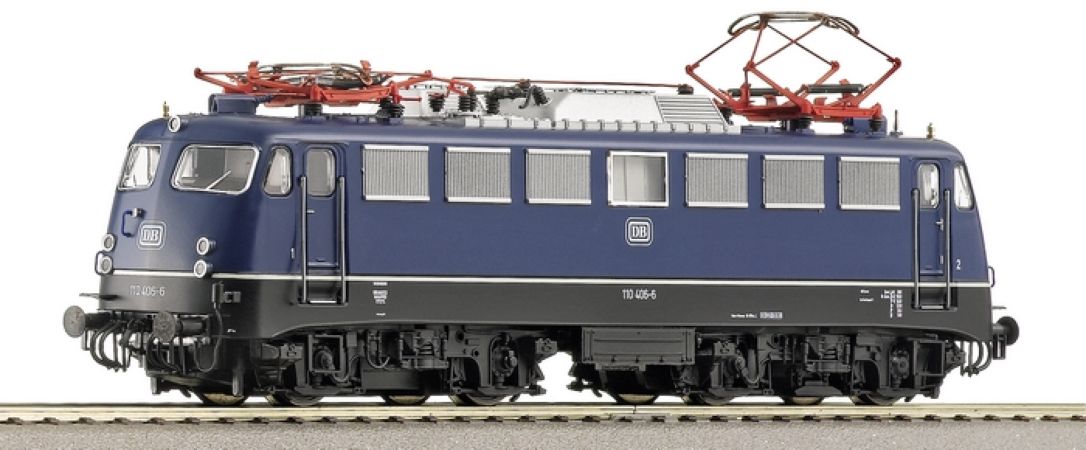 Modèle réduit ROCO de la locomotive électrique série 110.3 en couleur bleue de la Deutsche Bundesbahn (DB), mise en service dans les années 1980 et qui était affectée aux trains rapides et directs.