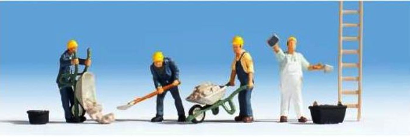 Boite de 4 figurines représentant des maçons avec leurs accessoires.