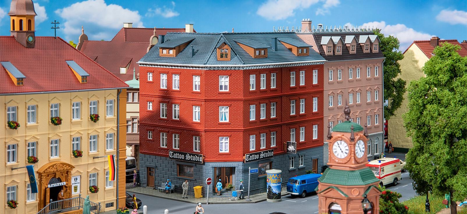 Nous vous proposons, sous la référence FALLER 130138 cette superbe maison d'angle de ville avec studio de tatouage.