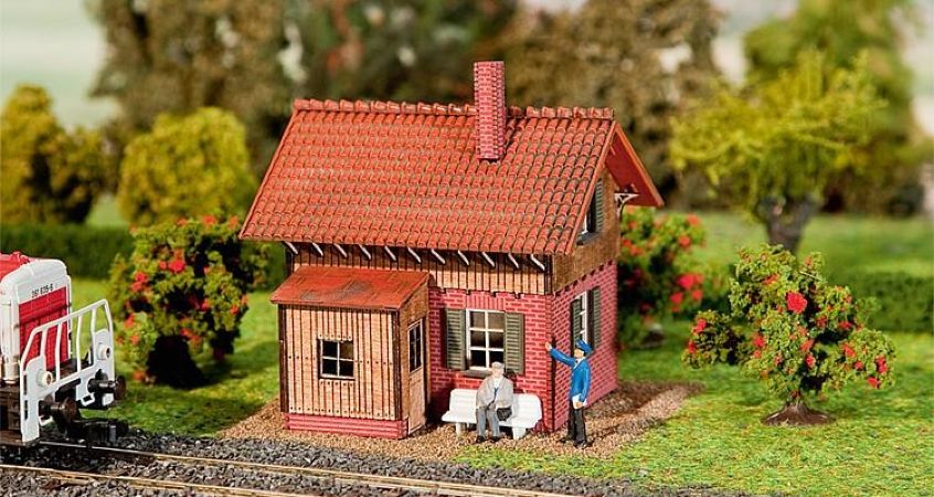 Maquette FALLER représentant une maison de garde-barrière dans un style de construction en briques recuites.