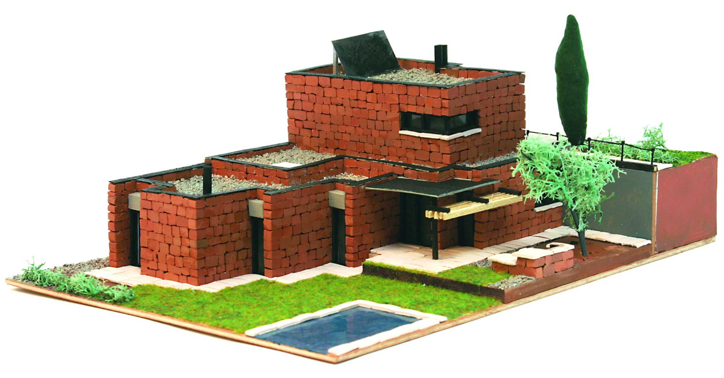 Proposée sous la référence Domus 40602, cette maquette à construire soi-même fait partie de la série "Actual" représentant des maisons de style contemporain (formes modernes) et comprend tous les éléments nécessaires à sa construction, y compris le support de base et la végétation.