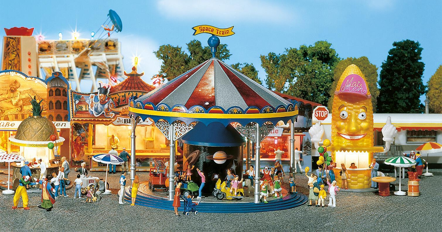 Maquette Faller à monter soi-même représentant un manège pour enfants dans un style typique des vieilles attractions de fête foraine.