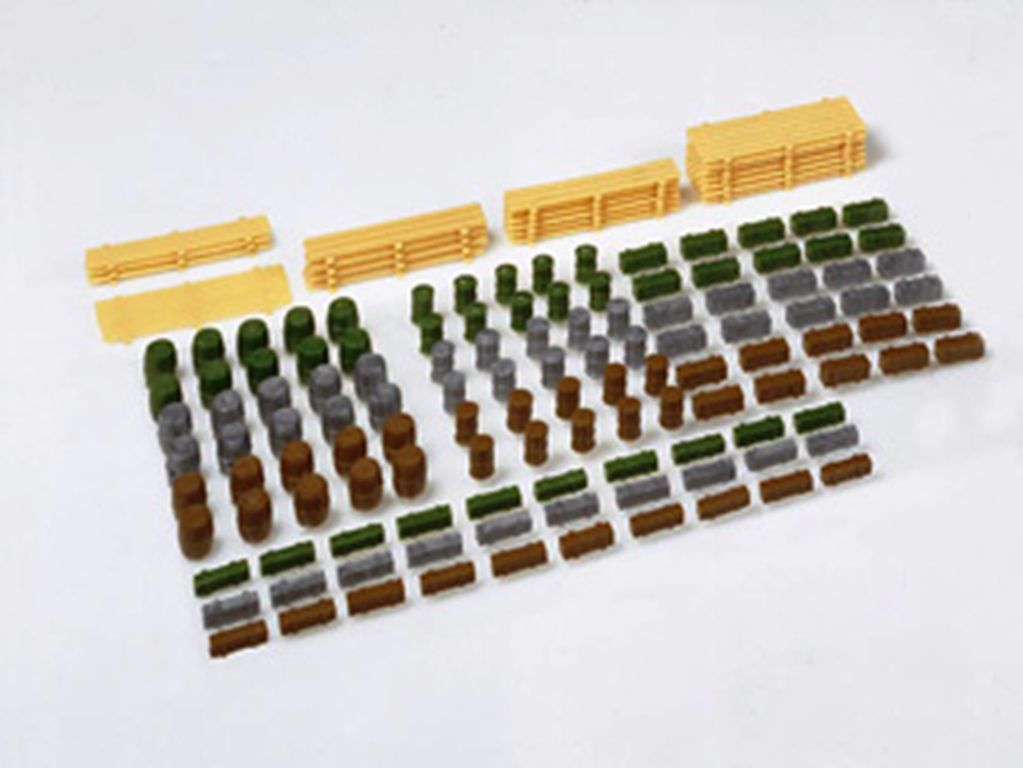 Maquette Faller représentant un ensemble de marchandises de chargement N, constitué de tonneaux, fûts, boîtes et conseils.