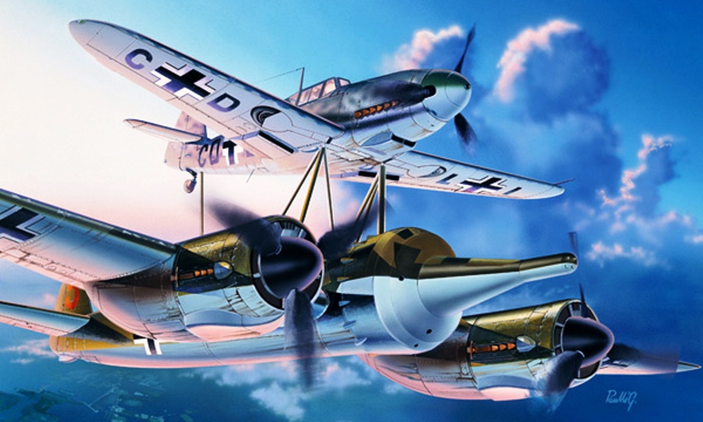 Maquette Italeri représentant des avions militaires, les Mistel 1 Ju88 et Bf109F