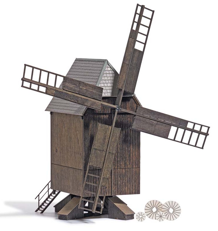Comme l’original, le kit est en bois véritable. La partie de la meunerie est orientable. En utilisant un moteur Faller (ref 180629), il est possible de motoriser les pales et leur conférer un lent mouvement rotatif. Le kit contient quatre meules en pierre et de la colle pour kit au laser.