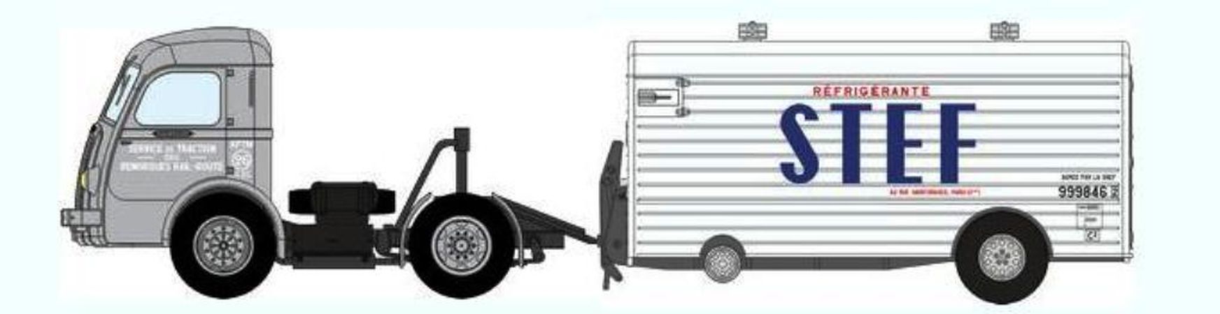 Véhicules REE représentant un tracteur Panhard Movic "APTM" Gris et sa remorque UFR " STEF "