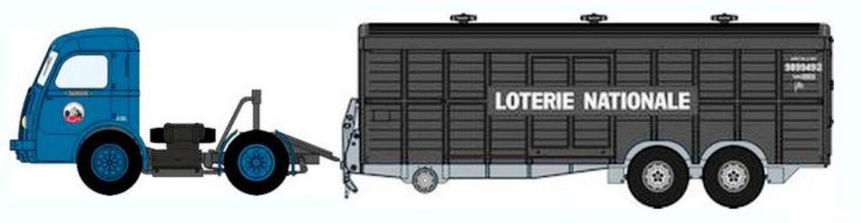 Véhicule REE représentant un tracteur Panhard Movic "SCETA" bleu et sa remorque UFR "LOTERIE NATIONALE"