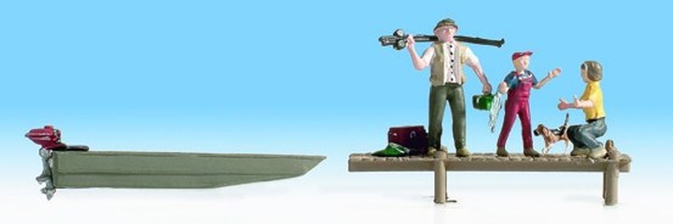 Cet article Noch 16802 comprend une barque de pêche, un quai en bois avec un chien + accessoires de pêche (collés au quai) et 3 figurines indépendantes.