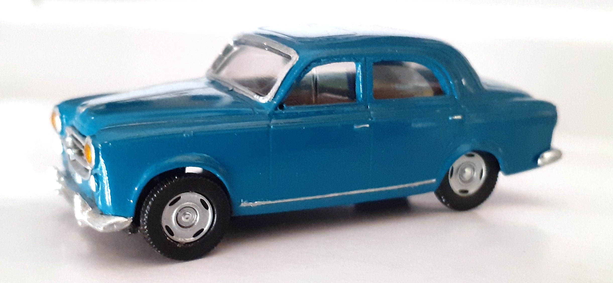 Véhicule miniatiure de collection, finement détaillé, représentant une Peugeot 403 Bleue.