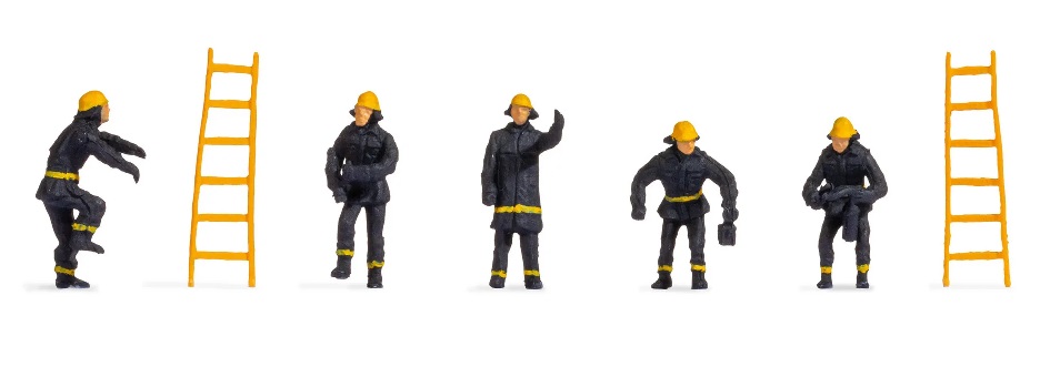 Figurines miniatures de la marque Noch à l'échelle HO (1:87) représentant des pompiers portant une combinaison de protection ignifugée.