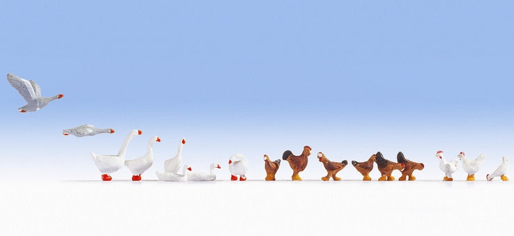 L'ensemble comprend sept oies, cinq poules brunes avec un coq et trois poules blanches.