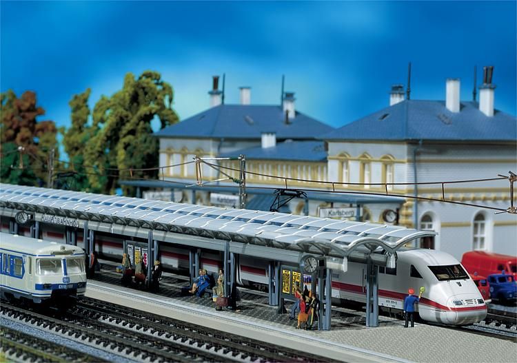 Maquette FALLER d'un quai de gare, de style moderne type ICE, avec salle d'attente sous verre, bancs, corbeilles à papier et tableaux indicateurs.