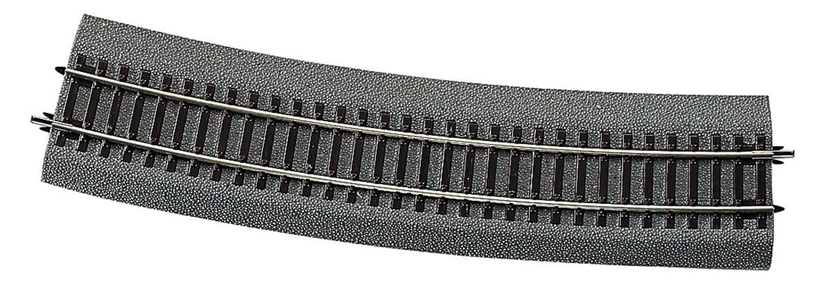 R10, r = 888 mm/15°, (contre-courbe conçue pour aiguillages et traversées jonctions à 15°), avec lit de ballast.