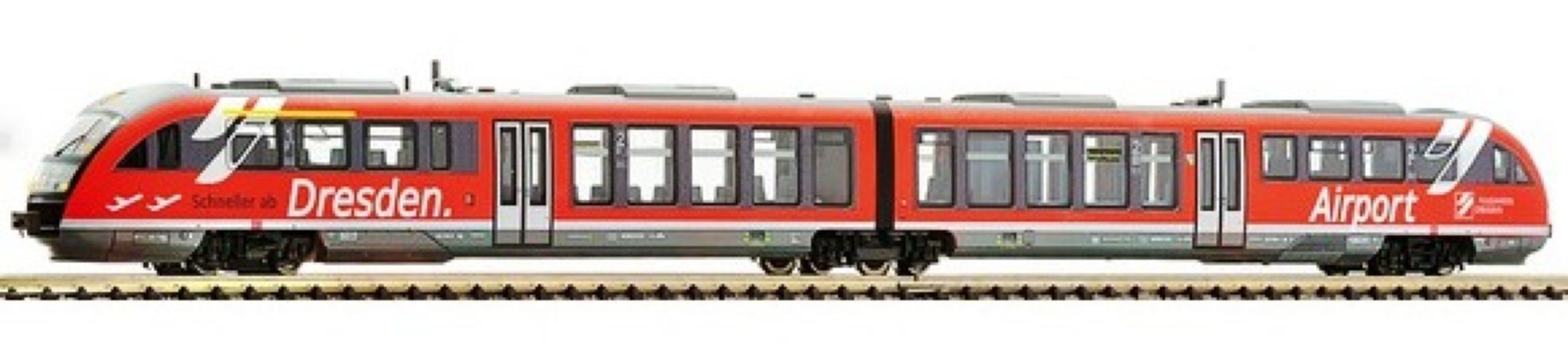 Modèle réduit Fleischmann finement détaillé représentant une rame Classe 642 diesel unité multiple de la Deutsche Bahn AG, avec l'aéroport de Dresde publicité, époque V.