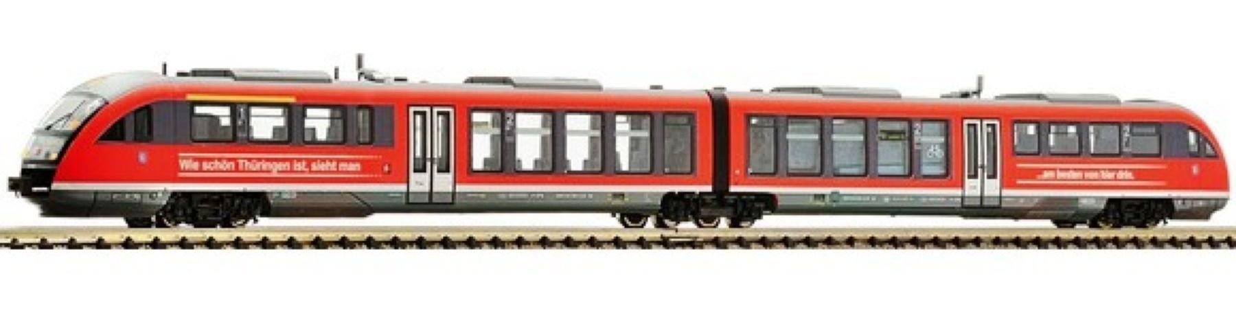 Modèle réduit Fleischmann finement détaillé représentant une rame Classe 642 diesel unité multiple de la Deutsche Bahn AG, avec la publicité "Thûringen", époque VI.
