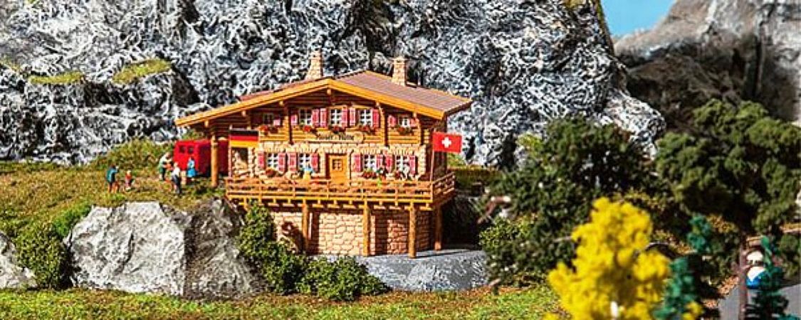 Maquette Faller représentant un refuge de haute montagne avec croix de sommet, construction en bois à deux étages avec grande terrasse de bronzage sur le devant, équipée de tables, bancs et panneaux solaires sur le toit. Offre aux randonneurs et skieurs une possibilité idéale de manger et passer la nuit.