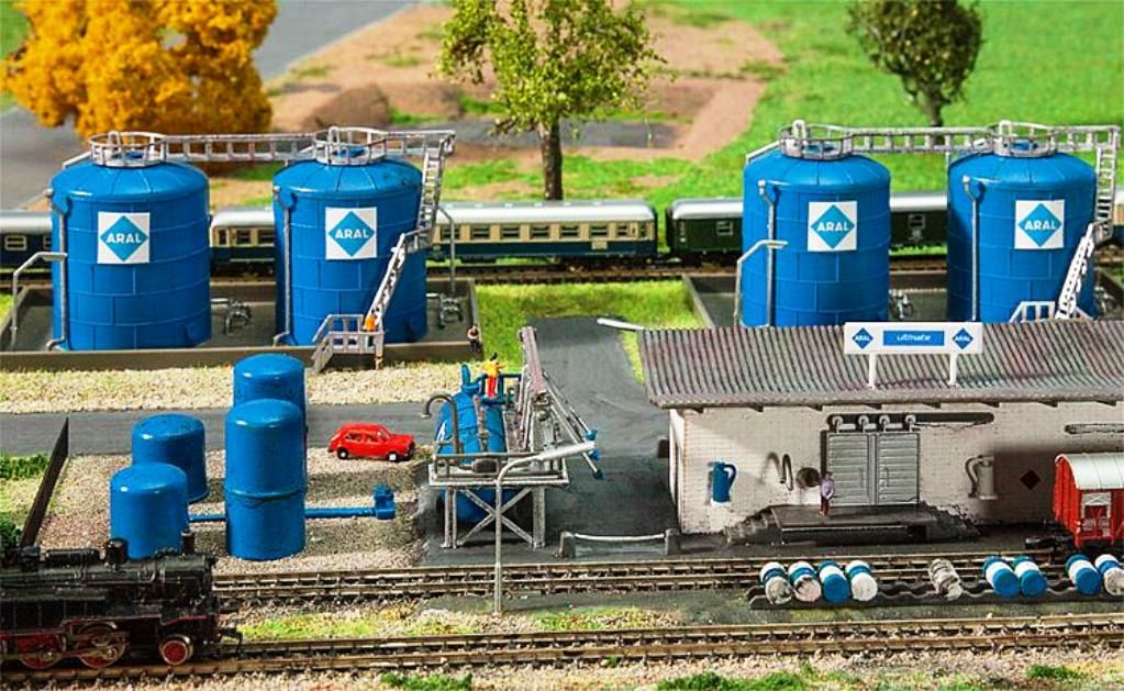 Maquette Faller représentant un grand parc de stockage ARAL composé d'un bâtiment de ferme avec le rail et camion rampe de chargement, une usine d'embouteillage, un système de pipeline, de nombreux barils et plusieurs réservoirs cylindriques verticaux et horizontaux, qui sont en partie accessible par des escaliers et des passerelles.