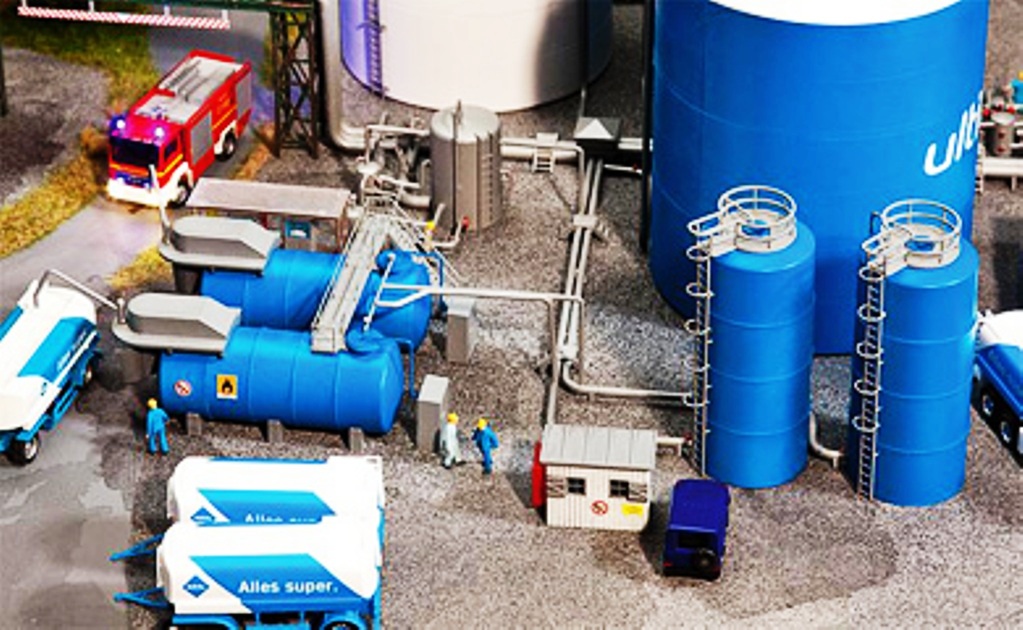 Maquette Faller représentant un petit système de réservoir ARAL avec deux cuves horizontales et deux cuves verticales de trois chaudières, des escaliers et des allées piétonnières.