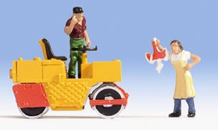 Accessoire de décor NOCH idéal pour modélisme ferroviaire et diorama, comprenant un rouleau compresseur et 2 figurines (le conducteur du rouleau compresseur et une femme brandissant une volaille)