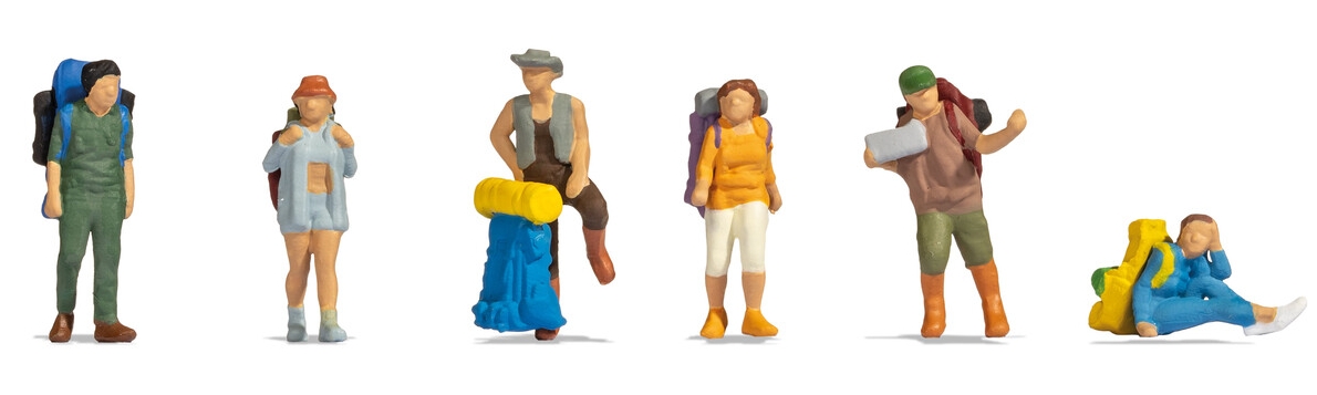 Figurines miniatures représentant 6 adultes sur le thème de l'auto-stop et du sac à dos. Tous portent un grand sac à dos et sont équipés d'ustensiles importants comme un matelas.