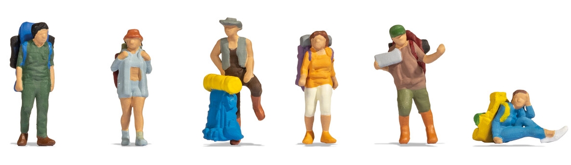 Figurines miniatures représentant 6 adultes sur le thème de l'auto-stop et du sac à dos. Tous portent un grand sac à dos et sont équipés d'ustensiles importants comme un matelas.
