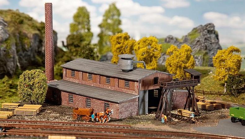 Cette maquette représente une scierie composée d'un grand hall avec un accès à la voie via un grand portail, d'une cheminée accolée, d'une installation d'aspiration et d'une grue de chargement.