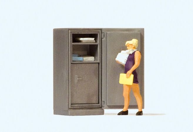Figurine PREISER représentant une secrétaire devant son armoire de rangement.