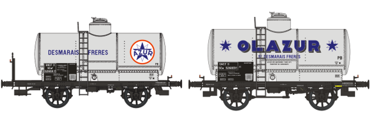 Set de 2 Wagons Citernes OCEM 19 rivetées, boites U1, plateforme serre-freins, ‘AZUR’ N°521659, et boites U1, frein à levier, ‘OLAZUR’ N°521693, Ep.III