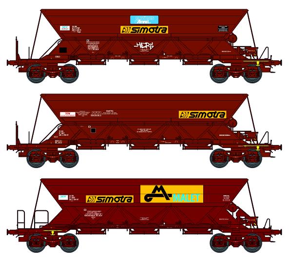 Set de 3 Wagons trémie EX Ep.IV-V «SIMOTRA / SIMOTRA / SIMOTRA MALET» avec chargement de cailloux