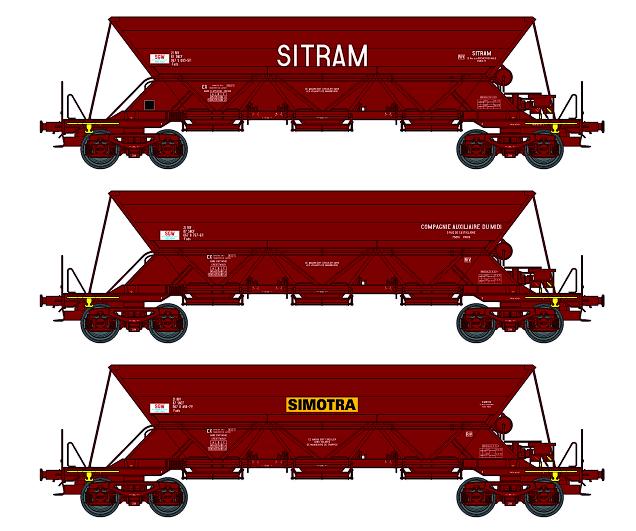 Set de 3 Wagons trémie EX Ep.IV-V «SITRAM / Cie Auxiliaire du MIDI / SIMOTRA» avec chargement de sable