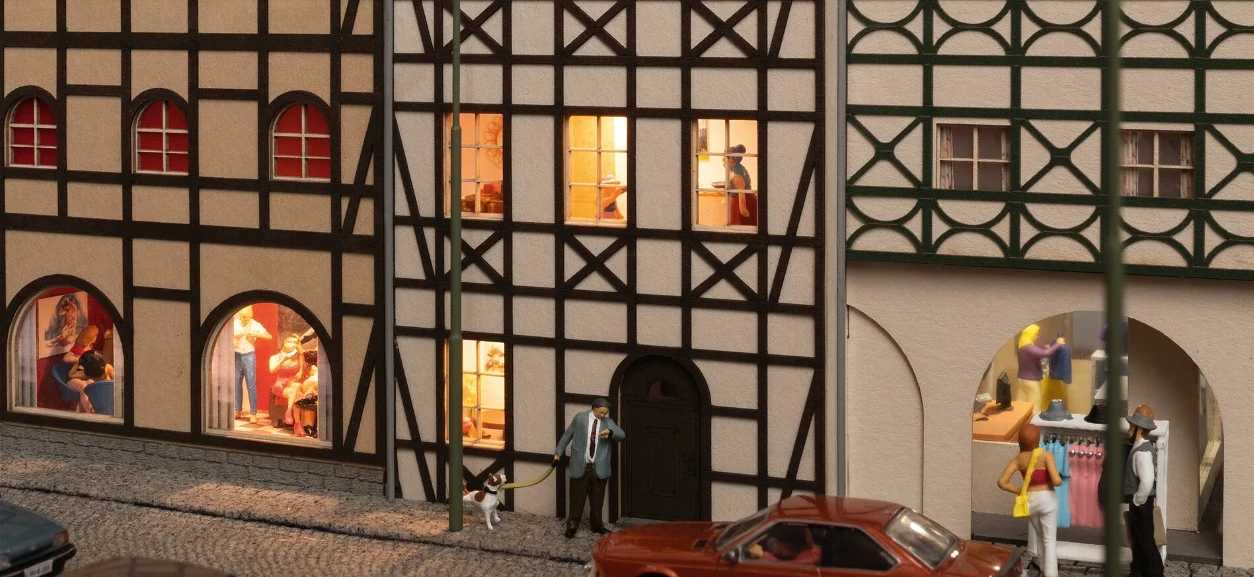 Jusqu'à présent, on connaissait des socles d'éclairage pour les bâtiments ou des caissons lumineux individuels pour les fenêtres. Le système micro-room de NOCH, quant à lui, est basé sur des caissons lumineux cartonnés de différentes tailles, qui peuvent être aménagés à l'aide des feuilles de décoration fournies. Avec un sol, du papier peint, etc., ils peuvent être décorés idéalement avec du mobilier et des figurines NOCH. Les LED sont fixées en haut du caisson lumineux. La lumière des LED, grâce à une feuille de diffusion fournie, est répartie de manière uniforme dans la pièce. Si vous le souhaitez, vous pouvez encore accrocher une paire de rideaux et voilà un autre point fort de ce système !