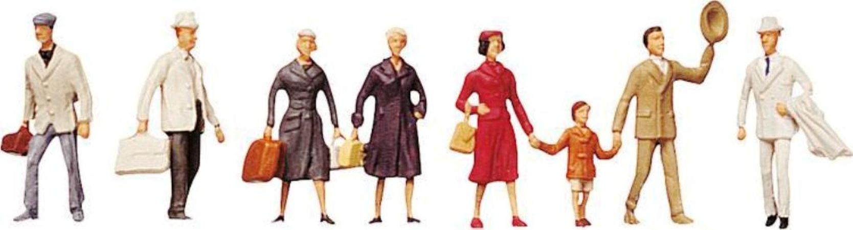 Figurines Faller représentant un lot de 8 voyageurs dont une famille avec un enfant.