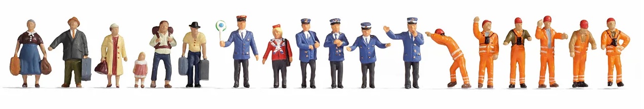 Proposé sous la référence Noch 16122, ce set contient 18 figurines individuelles peintes avec soin et correspond à un des thèmes importants du modélisme ferroviaire : Les personnages de gare.