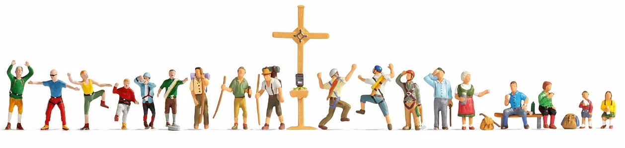 Proposé sous la référence Noch 16140, ce set contient 18 figurines individuelles peintes avec soin et correspond à un des thèmes importants du modélisme ferroviaire : Les personnages de montagne.