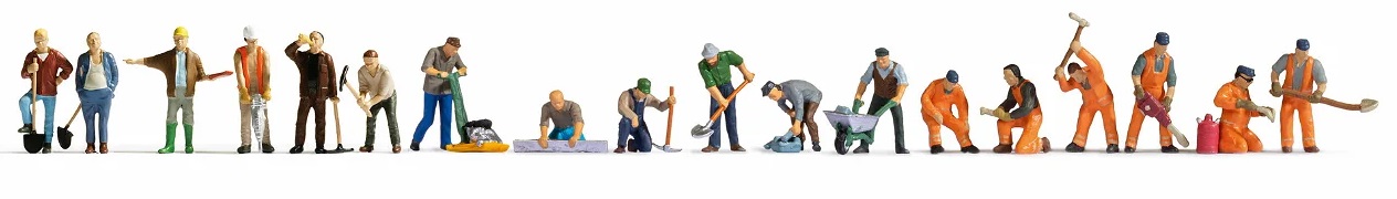 Proposé sous la référence Noch 16111, ce set contient 18 figurines individuelles peintes avec soin et correspond à un des thèmes importants du modélisme ferroviaire : Les travailleurs.