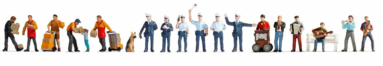 Proposé sous la référence Noch 16125, ce set contient 19 figurines individuelles peintes avec soin et correspond à un des thèmes importants du modélisme ferroviaire : Les personnages en ville.