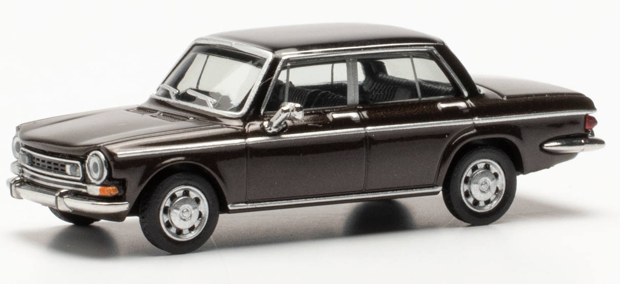 Retrouvez chez Easy-Miniatures, sous la référence Herpa 430746-002, cette superbe miniature finement détaillée représentant une Simca 1301 Special, de couleur marron metallisé avec toit noir, pare-chocs chromés et les enjoliveurs appropriés.