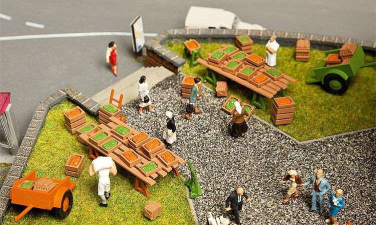 Kits contenant divers objets caractéristiques de l’équipement d’un stand de marché, tels que cageots de fruits remplis et entassés de diverses tailles, diables, sacs, étalages, remorques, etc.