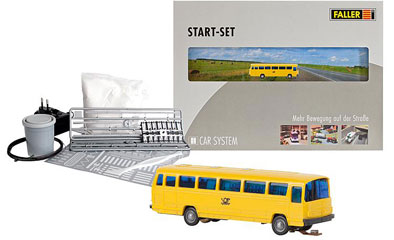 - Set de démarrage Car System incluant unMB 0302 autobus poste à l'échelle N, un chargeur secteur, un rouleau de 10m de câble de guidage, un sachet d’enduit de route, un pot de peinture de route, des glissières, des piliers de délimitation et une instruction détaillée