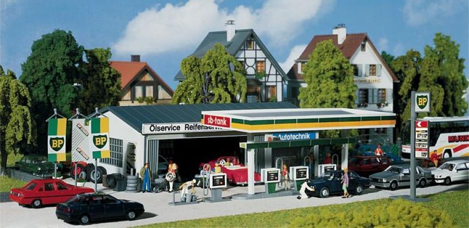 Maquette Faller à assembler soi-même, représentant une exploitation de station service, composé d'une rangée de pompes couvertes et d'un bâtiment de garage séparé avec une piece de commerce et de bureau.