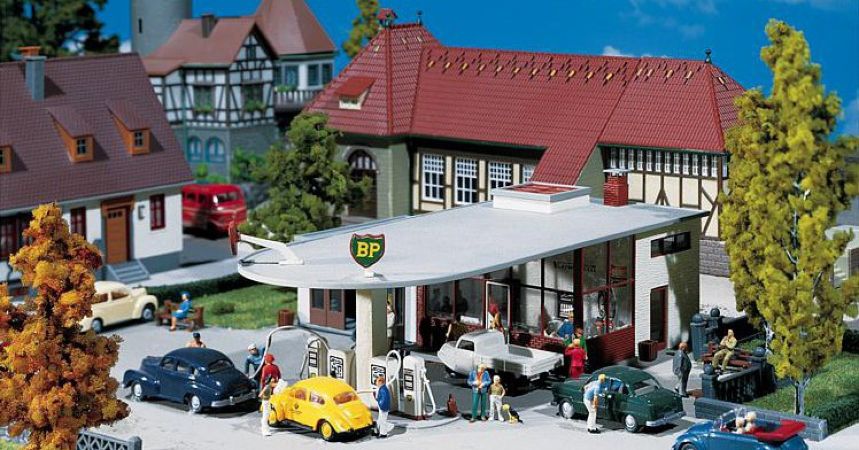 Cette maquette reprsente une station service BP dans le style architectural des années 50 avec pompes à carburant couvertes d’un toit arrondi et caisses.