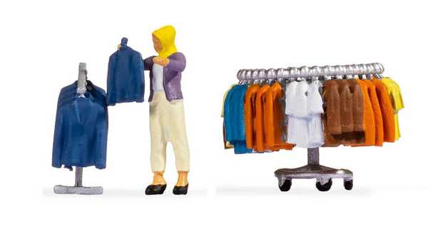 Retrouvez chez Easy-Miniatures, sous la référence Noch 16509, la Tiny-Scenes « Achat de vêtements », comprenant 1 cliente, 1 présentoir debout avec des vêtements et 1 étagère sur roulettes avec des vêtements suspendus