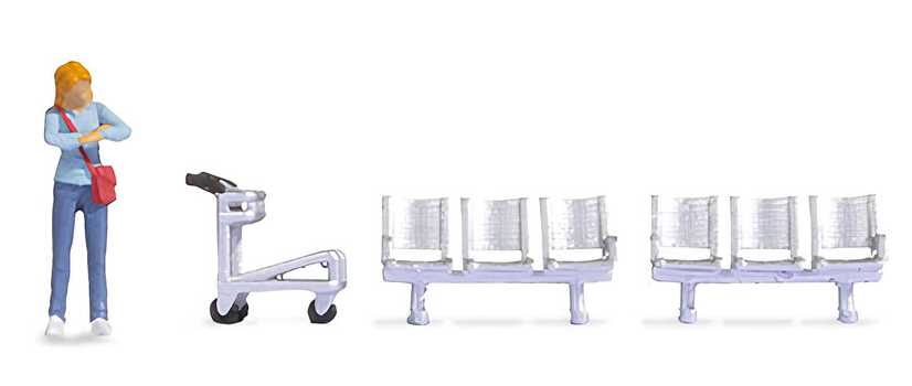 Retrouvez chez Easy-Miniatures, sous la référence Noch 16528, la Tiny-Scenes « Sur le quai de gare », comprenant 1 voyageur, 1 chariot à bagages et 1 banquette 3 places