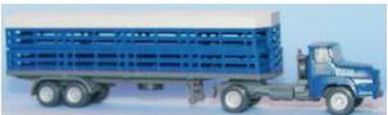 Modèle réduit représentant un Tracteur UNIC avec remorque à clairevoie, de couleur bleu, toit blanc