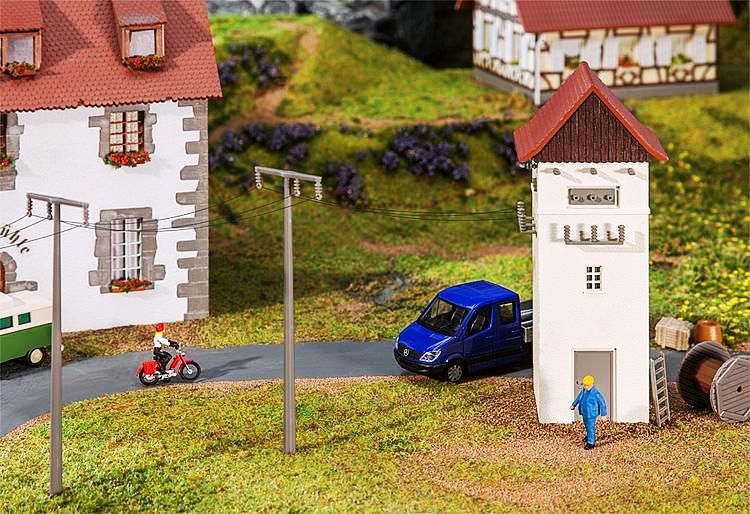 Maquette Faller représentant une tour rural avec une petite base carrée et un lambris sur le pignon, toiture en tuile et isolateurs latéraux pour la connexion de la ligne d'alimentation.