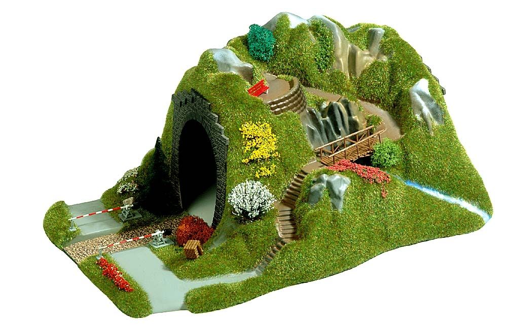 Tunnel droit avec ponton et passage à niveau. Adapté aux parcours droits à voie unique.