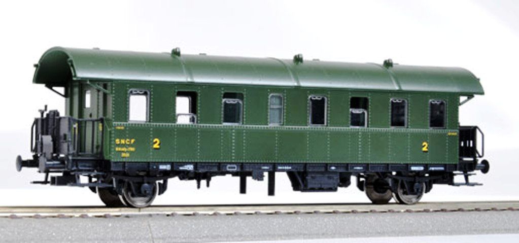 Modèle réduit Fleischmann représentant une voiture 2ème classe SNCF boite à tonnerre.