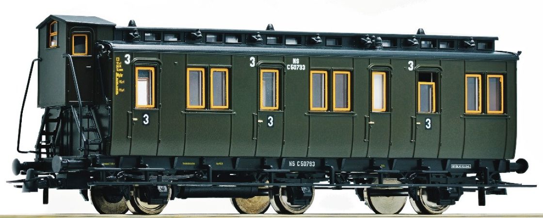 Modèle réduit Roco représentant une voiture à compartiments, 3e Classe avec guérite de freins, des chemins de fer néerlandais Modèles avec un design intérieur, et préparer pour l'éclairage intérieur.