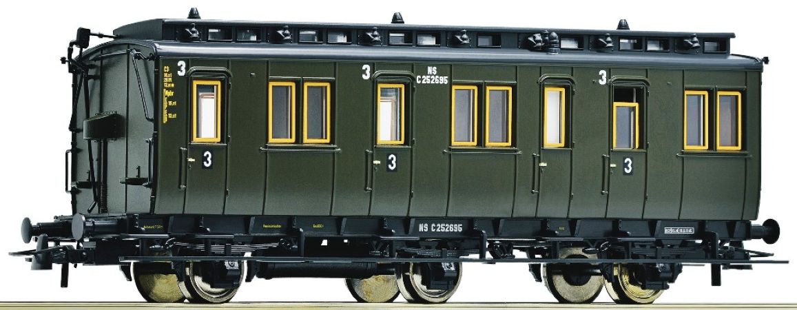 Modèle réduit Roco représentant une voiture à compartiments, 3e Classe sans freineur des chemins de fer néerlandais Modèles avec un design intérieur, et préparer pour l'éclairage intérieur.